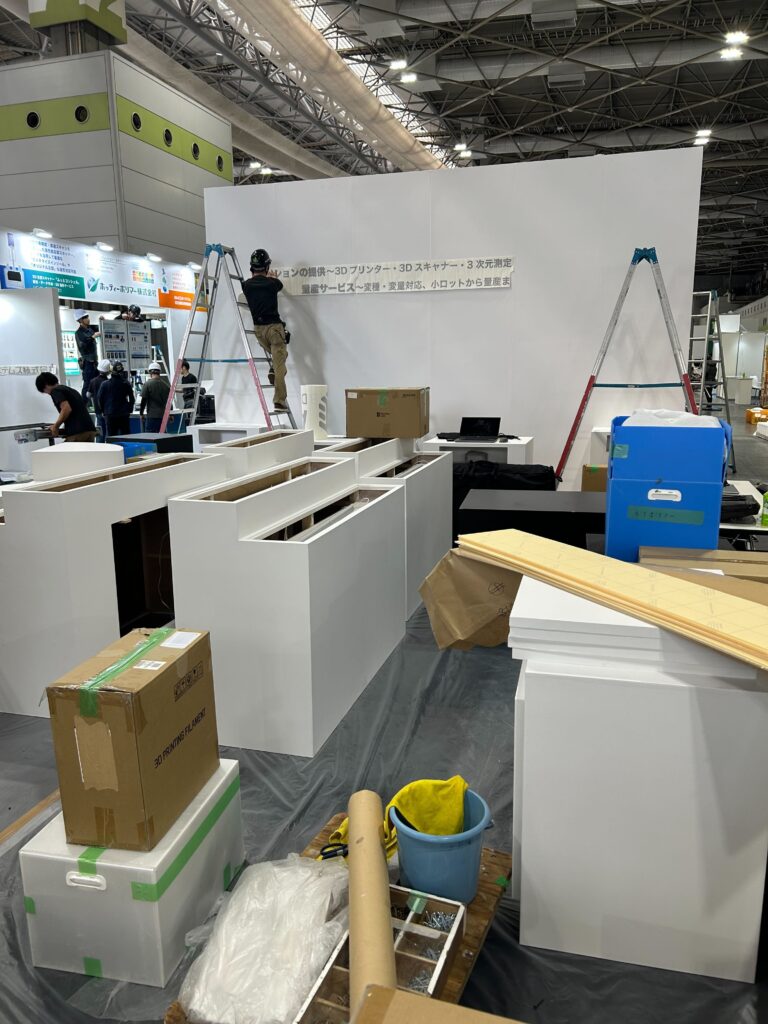 展示会前日の9月30日、スタッフ一同、ブースの設営作業に取りかかりました。
